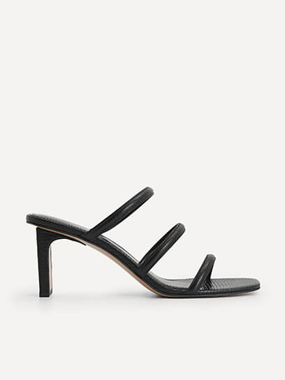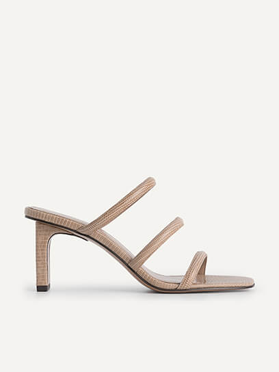 and Strappy Heeled Lizard-effect Sandals with a similar-toned bold outfit. The reptilian-make on the surface adds texture